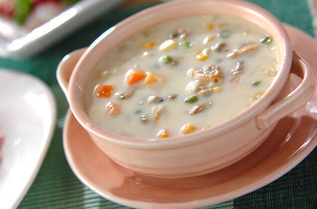 あさりのチャウダーは、むき身のあさりとミックスベジタブルを使ったスープ料理です。あさりの旨みがたっぷりと詰まったクリーミーなスープで、子どもでも食べやすい味に仕上がります。ミックスベジタブルを使うことで彩りもよく、献立が華やかになるレシピです。