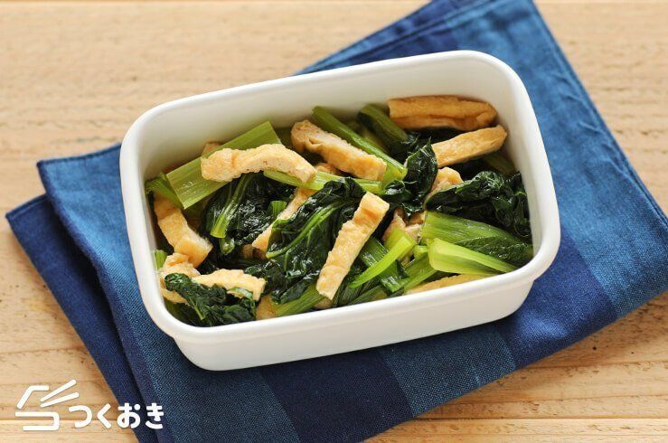小松菜の煮浸しは、小松菜と油揚げを使ったシンプルな定番常備菜です。小松菜と油揚げに出汁が染み込み、作り置きしたものを温め直しても冷たいままでもおいしくいただけます。お弁当にもおすすめです。