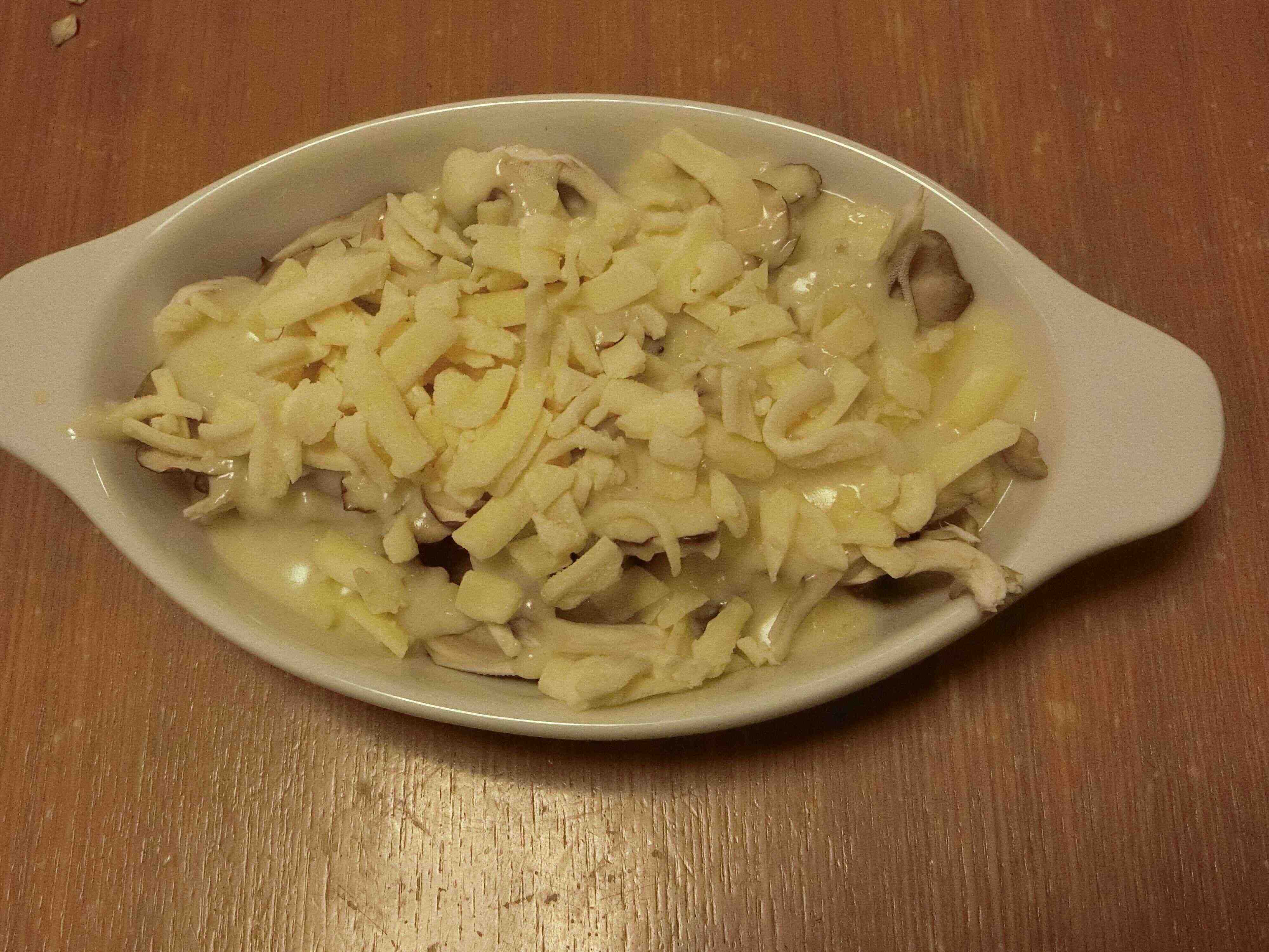 1.グラタン皿にサバの缶詰、細かくほぐした舞茸を載せます。