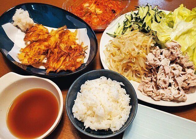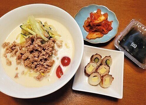 疲労度MAXの金曜日は、ちくわやもずく、キムチなど、副菜も徹底してラクな物に。麺の具は、作り置きの豚そぼろを活用して、ラクに栄養アップ。