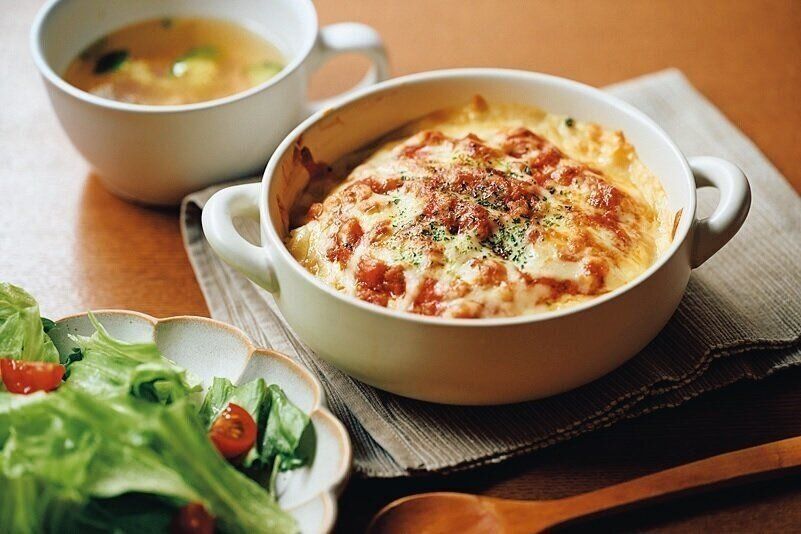 作り置きしておいた豆乳ホワイトソースとミートソースの合わせワザでドリアに。「ご飯に2種類のソースをかけてトースターで焼くだけ。子どもたちが大好きなメニューです」。