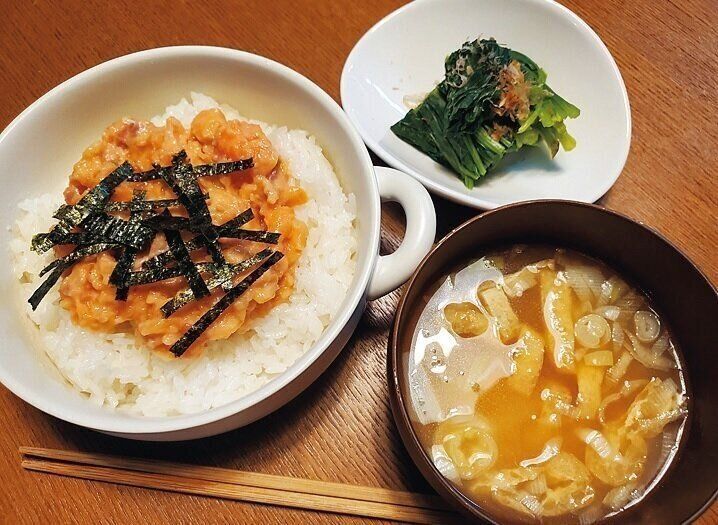 週初めの月曜日は、ご飯にのせるだけでできるサーモン丼で体力を温存。愛用する業務スーパーの「サーモンたたき」は、必要な分だけ解凍できて便利でムダがない!