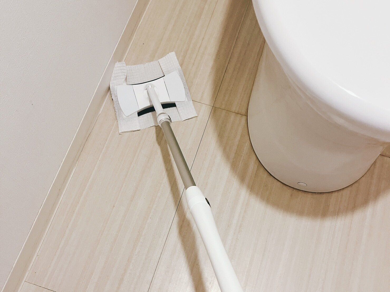 まずは、トイレシートで手前から奥にかけて拭いていきます。奥側から先に拭いてしまうと、手前に落ちているホコリや髪の毛を踏んでしまいますので、手前から奥に向けて拭くのが鉄則です。ここで、ミニワイパーを使うと腰を曲げず、そして便器の裏側までも軽々と届くのでおすすめです。