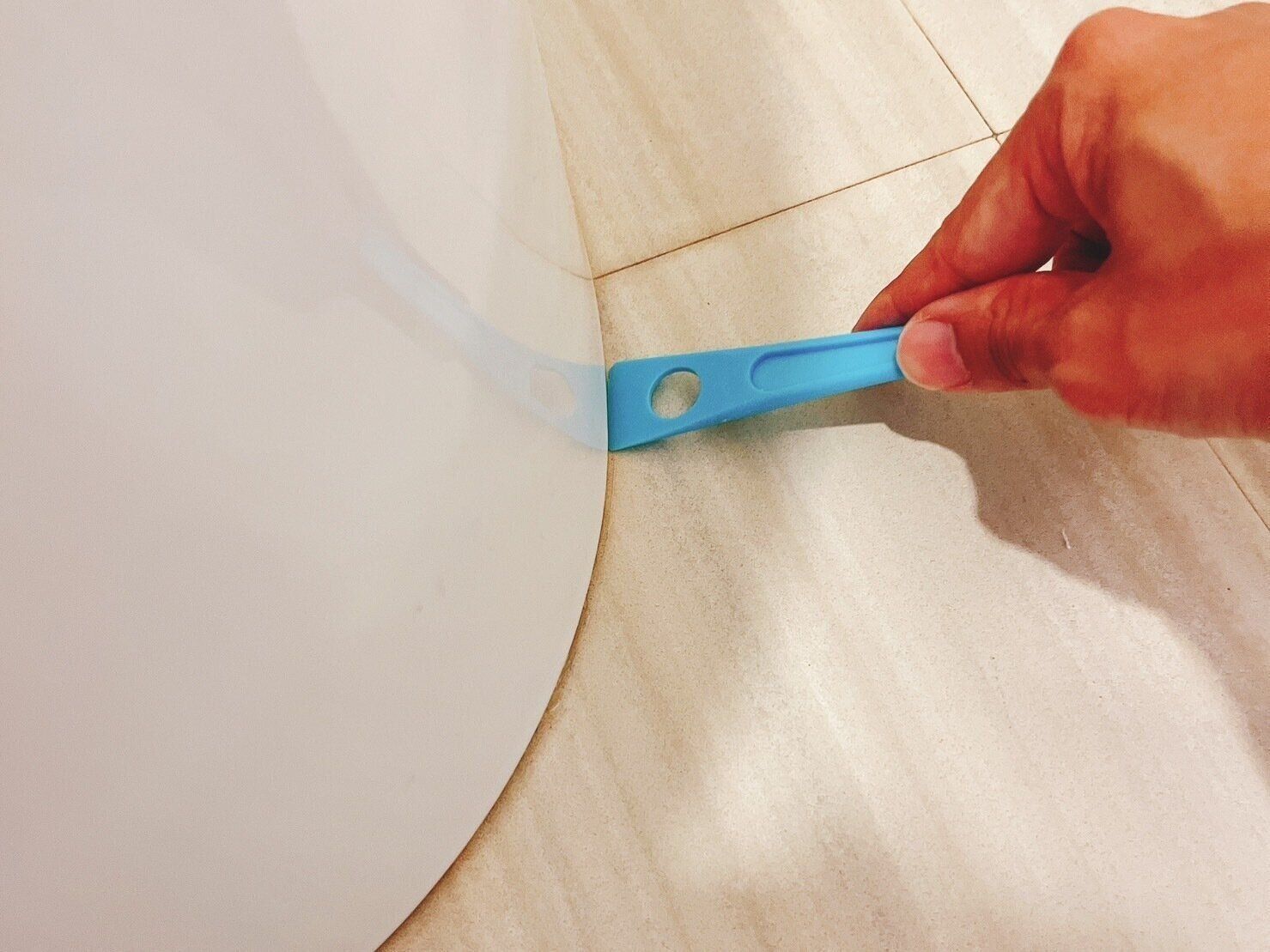 仕上げは、トイレ用シートをヘラで挟み、便器と床の間に入れ、汚れを拭き取っていきます。