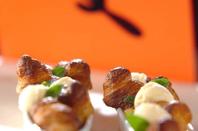 「メープル風味のパンプディング」は、クロワッサンを使ってパンプディングをつくるレシピです。クロワッサンの形状も活かして、かわいくおしゃれなパンプディングができあがります。