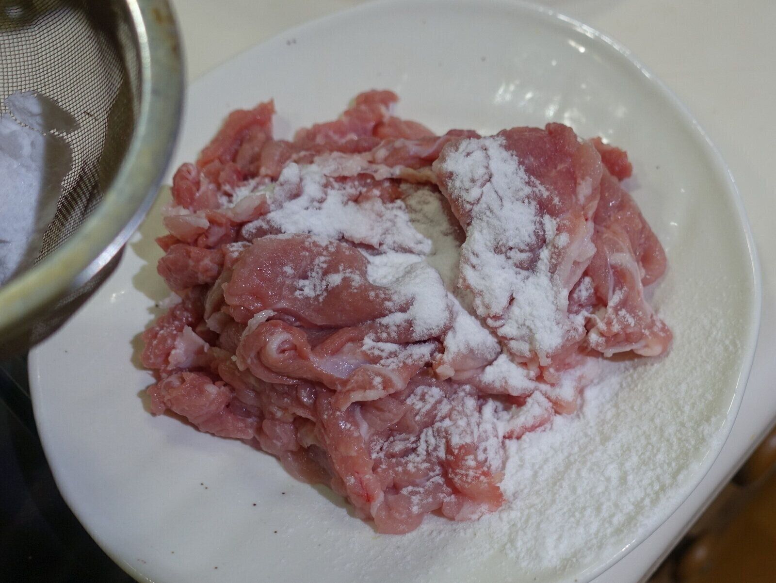 一方で、豚こまや肩ロースなど脂身が少ないお肉はパサついて、タレをからめただけでは正直おいしくありません。そんなときは片栗粉をまぶす方法を試してみてください。