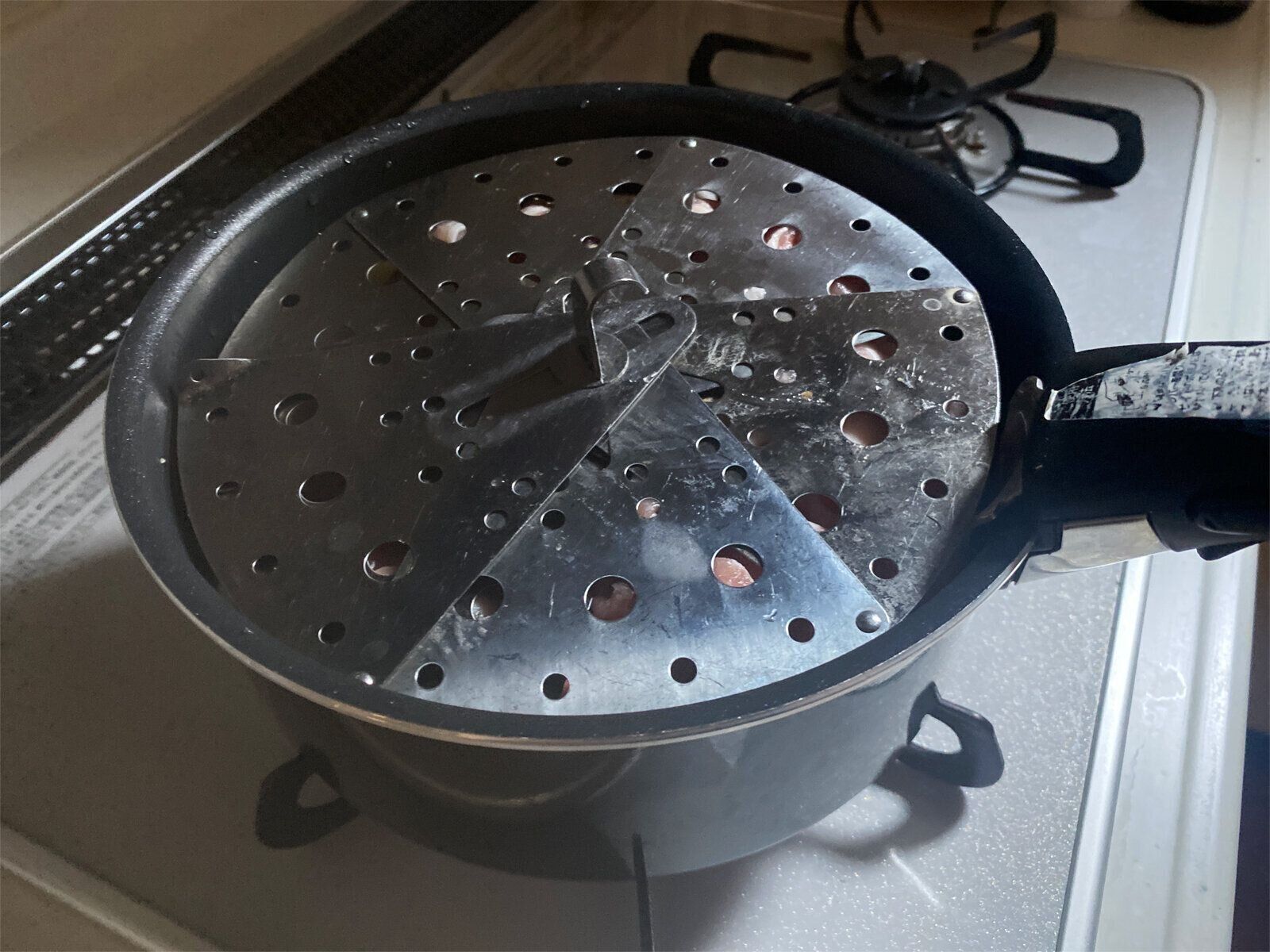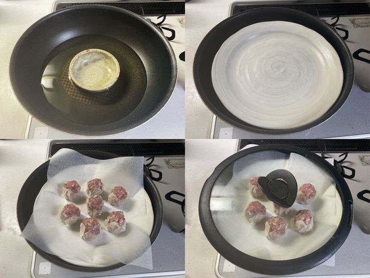 蒸し器の代わりに用意したいのがフタつきの鍋、もしくは深めのフライパンです。鍋やフライパンにお湯を沸かし、底にココットや小鉢などを置きます。その上に平らなお皿やバットを乗せ、食材を並べて、フタをすれば、蒸し器の代わりになります。