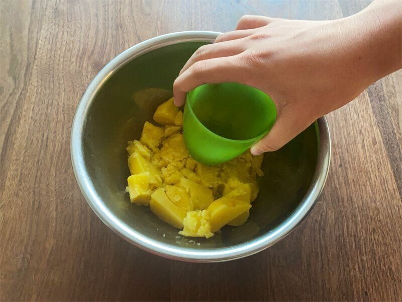 マッシャーは食材に力が加えやすくつくられていますが、ほかのものでも代用可能。例えば、しゃもじやフォーク、すりこぎや麺棒などがあれば、つぶすことができます。
