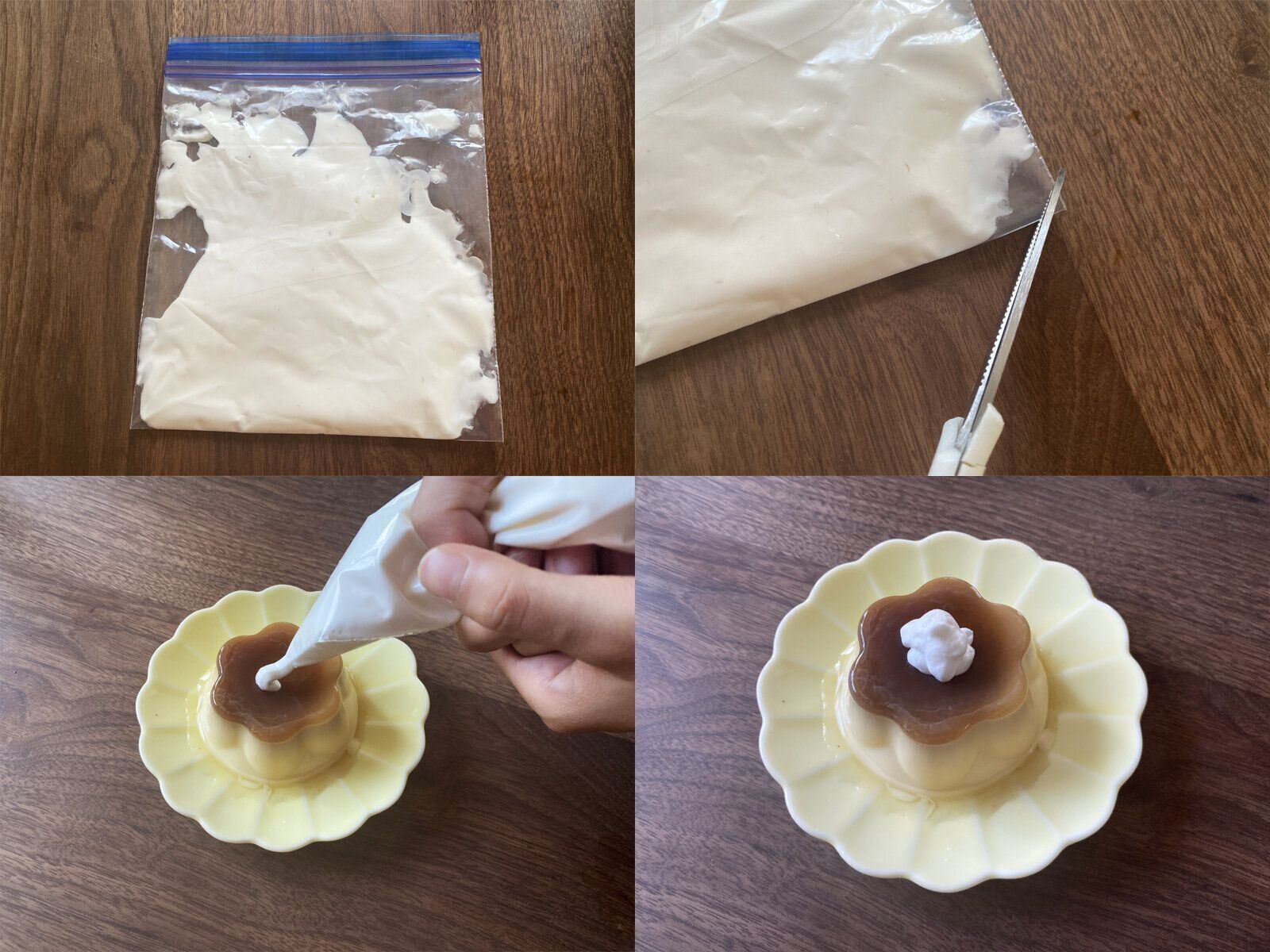 ホイップクリームなどを入れたら、口を閉じて、角をハサミでカットして使います。口金を入れたいときには、先に口金の大きさに合わせて角をカットし、口金を差し込んでから、絞り出したいものを入れます。なお、力を入れすぎたり、硬いものを絞りだそうとしたりすると、絞り袋に比べて破けやすいので、注意してください。