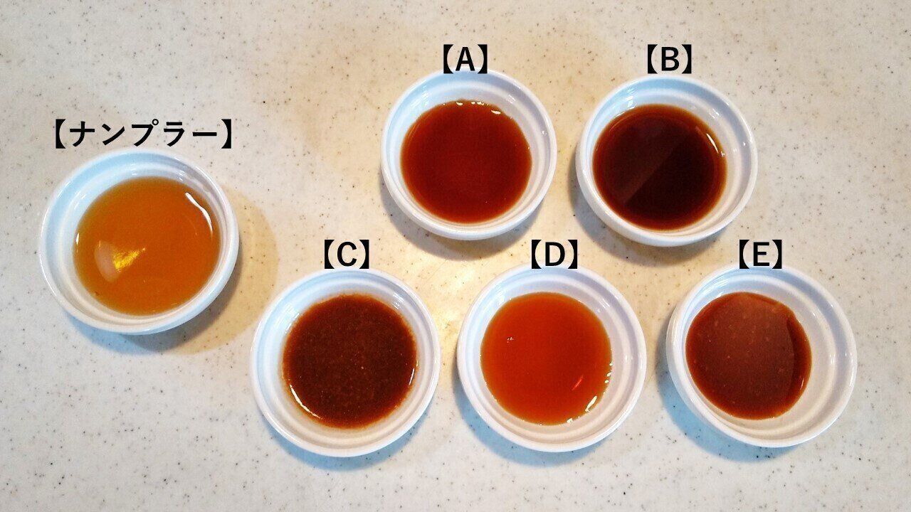 画像のいちばん左が「ナンプラー」、上段左から順に【A】【B】、下段左から順に【C】、【D】、【E】を混ぜ合わせたものを並べてみました。