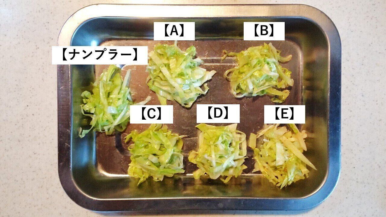 今回は、油少々で炒めたキャベツに代用ナンプラーを回しかけ、サッと炒め合わせたもので食べ比べをしてみました。その結果は次のとおりです。