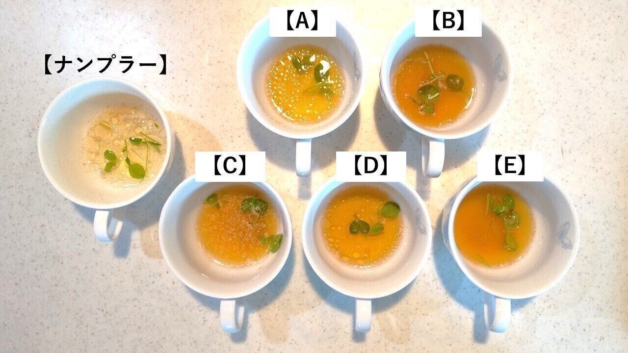 スープは豚ひき肉を酒と水とともに温め、アクを取り除いて塩こしょうで薄く味を調えたものを用意し、そこへそれぞれの代用ナンプラーを同量ずつ加えていきました。加熱後のスープに加えたため、炒め物よりは香りが残っていることが考えられます。その結果は以下のとおりです。