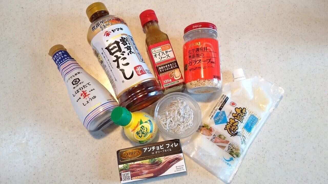 濃口しょうゆをベースに、うま味のある鶏がらスープの素、オイスターソース、アンチョビ、白だし、塩麹、しらす干し、さらに発酵した風味を加えるレモン果汁も組み合わせて以下のように5通りの組み合わせを考えました。括弧内は、実際につくった際の分量となっています。