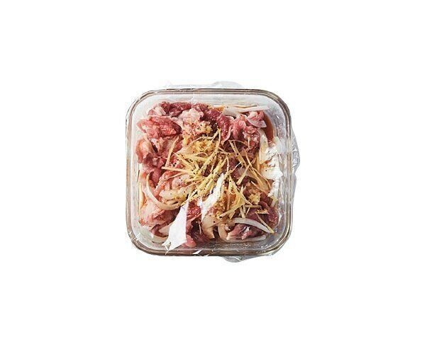 豚肉と薄切りにした玉ねぎを耐熱容器に入れ、[A]をもみ込む。[B]を加えてさらにもみ込み、C をのせて黒こしょうをふる。