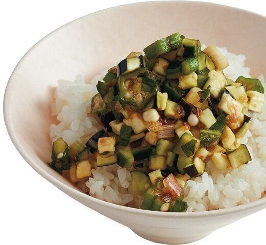 (1)なす、きゅうり、みょうが、青じそは5mm角に切る。オクラは塩少々(分量外)を加えた湯でゆでて冷水にとり、水けをしっかり拭いて小口切りにする。
