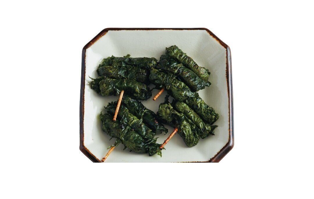 (1)くるみはポリ袋に入れてめん棒などで細かく砕き、[A]と混ぜ合わせる。青じその裏側の端に1/12量ずつのせてクルクルと巻いて、3個ずつ楊枝で刺す。