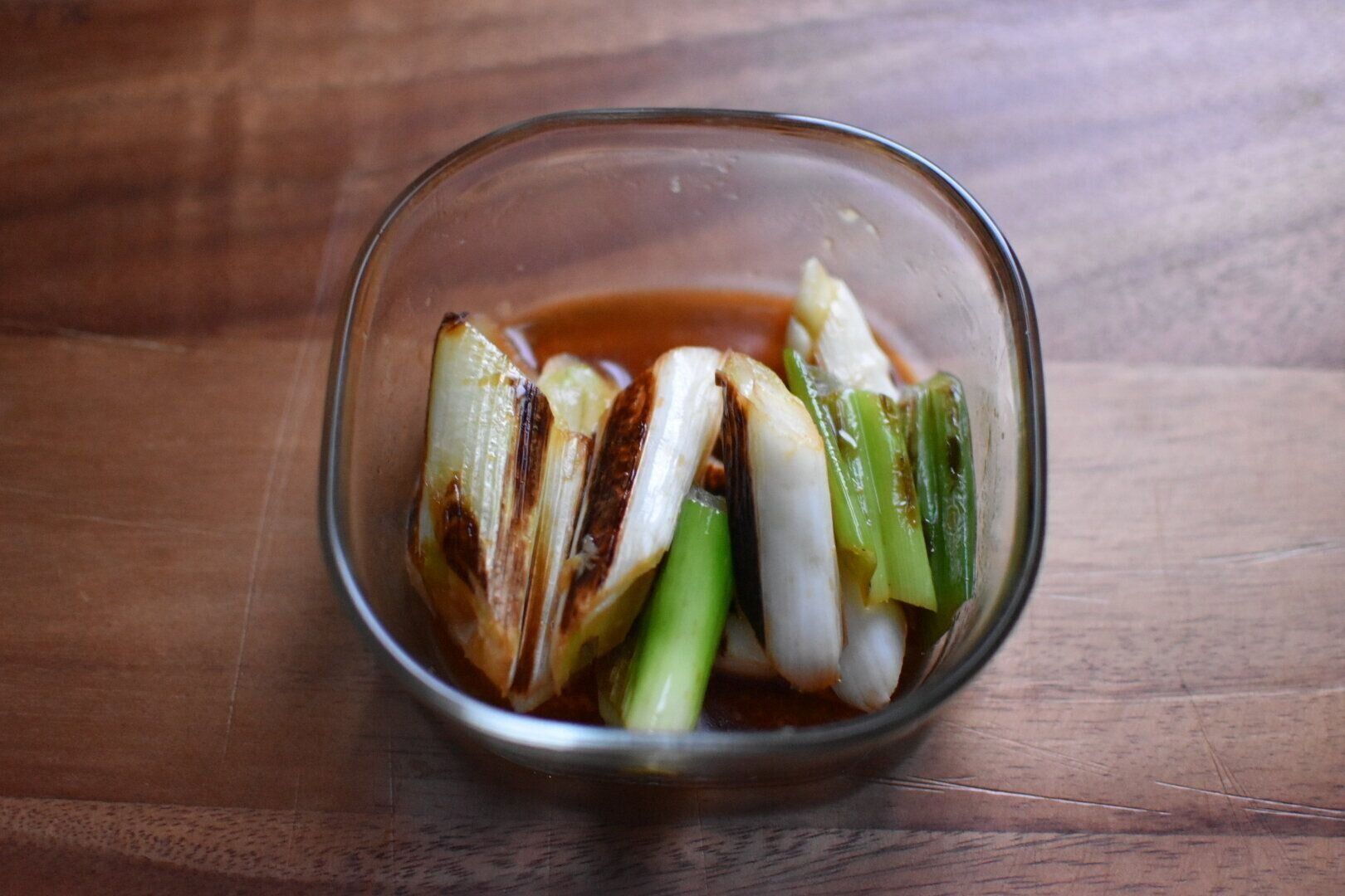 めんつゆとしょうがをしっかりと混ぜ、焼けたネギを漬ける