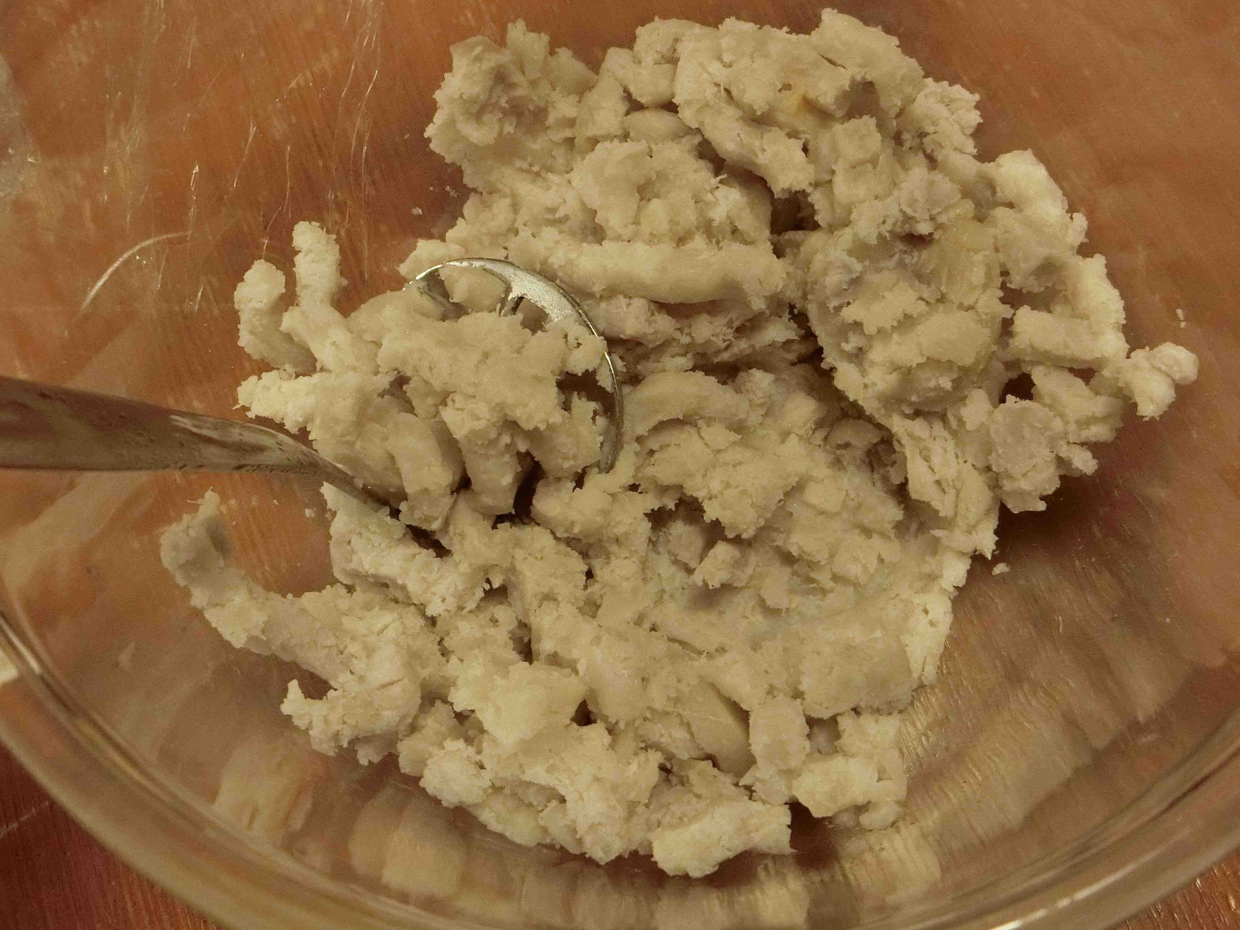 1.里芋は皮をむいて小さく切ります。耐熱容器に入れて電子レンジ600Wで5分加熱し、熱いうちにつぶします。