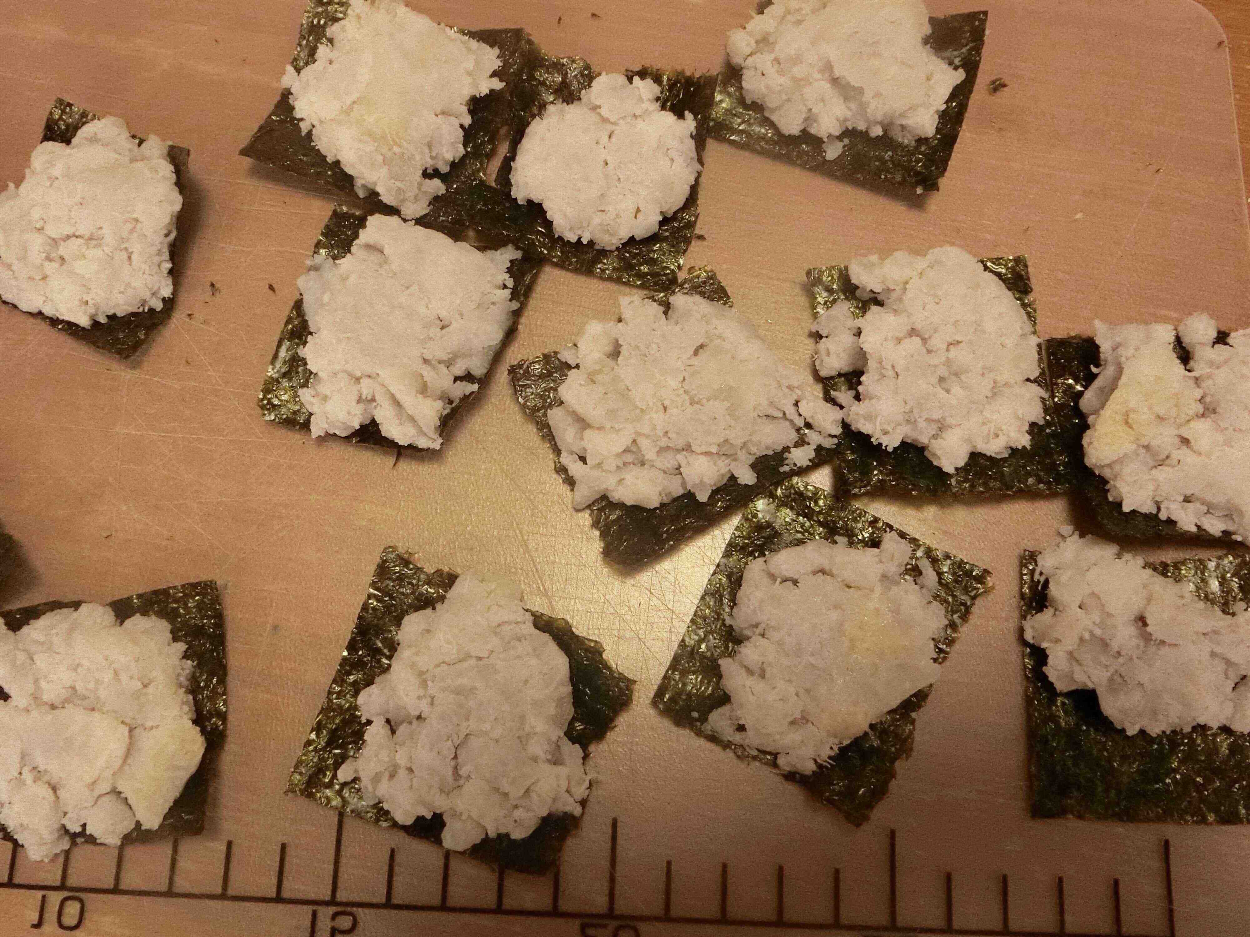 2.海苔を16等分にし、1をスプーンで海苔に塗るように載せます。