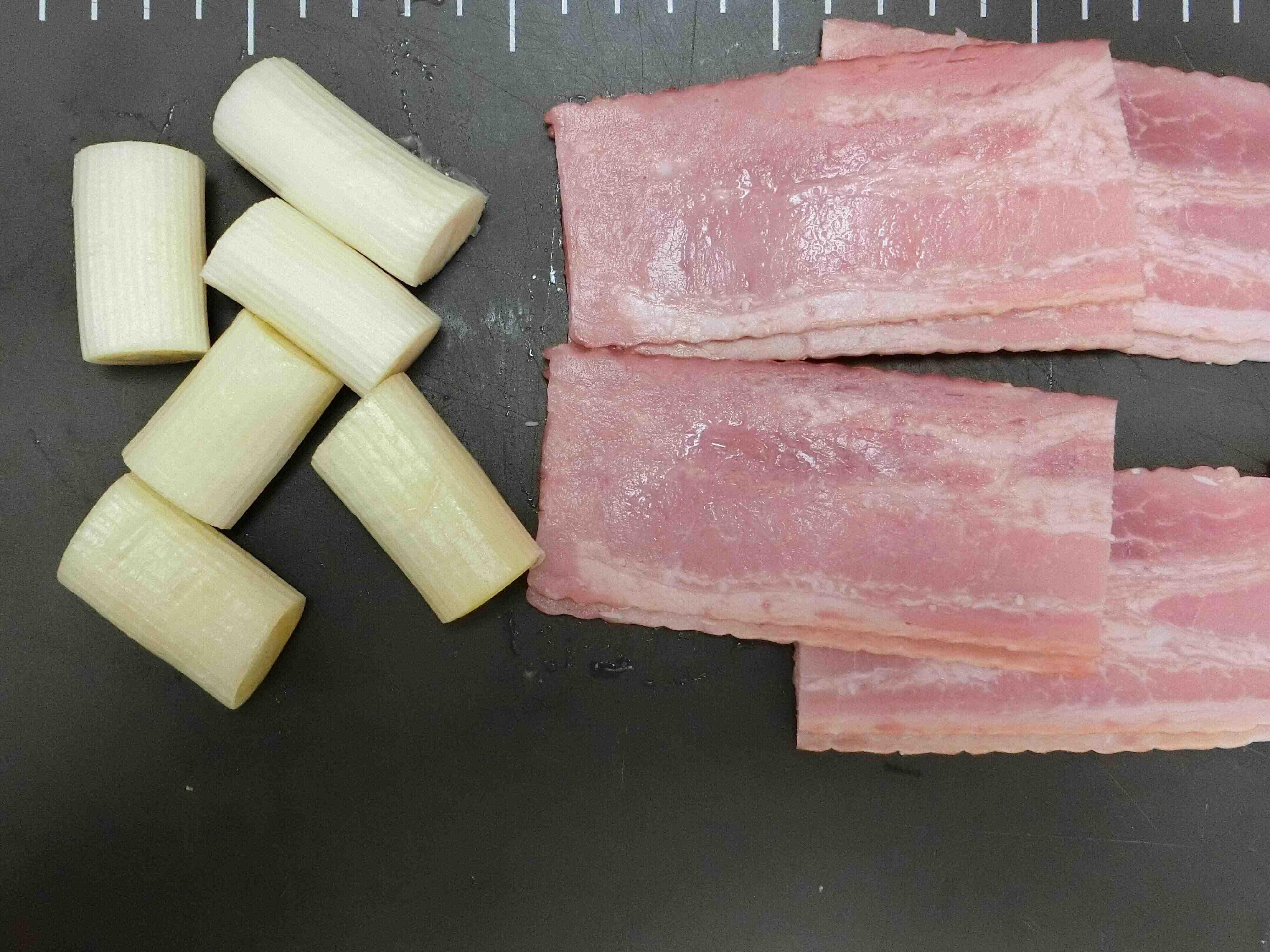 1.長ネギは8等分にし、ベーコンは長さを半分に切ります。ニンニクは薄切りにします。