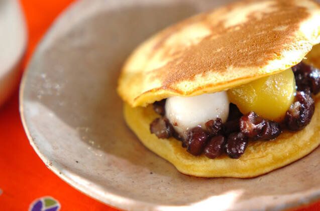 「どら焼き風パンケーキ」では、カステラの代わりに小さめに焼いたパンケーキをどら焼きの皮として使い、間に餡やクリームなどを挟んで好みのどら焼きを作れます。冷凍してあるパンケーキが大きめの場合は、小さくカットして使ってみましょう。