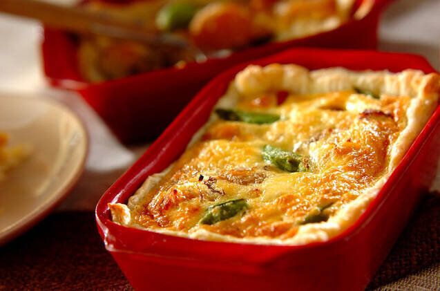 パイ生地に解凍しておいた肉じゃがと具材、卵液を入れ、オーブンで20~25分程度焼けばできあがります。レシピに掲載されている具材以外にも、いろいろな具材や味付けでアレンジできます。