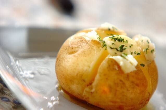 「ホクホクポテト」は、オーブンで焼いたじゃがいもにバターをのせるだけでおいしく食べられる簡単レシピです。冷凍のままバターをのせると、オーブンで焼いたじゃがいもの温度が下がってしまうため、常温に戻して使いましょう。