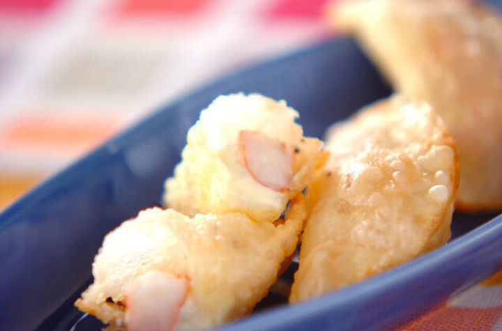 「エビとチーズの包み揚げ」は、レシピ名の通りエビとチーズを餃子の皮で巻くことで、サクっ、カリっとしたスナック感覚の料理に仕上がります。