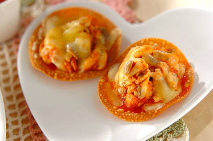 餃子の皮の下準備としてオーブンで焼きながら、具材を和えておきます。焼きあがった餃子の皮に具材を乗せ、チーズをトッピングして再度チーズが溶けるまで焼いて完成です。