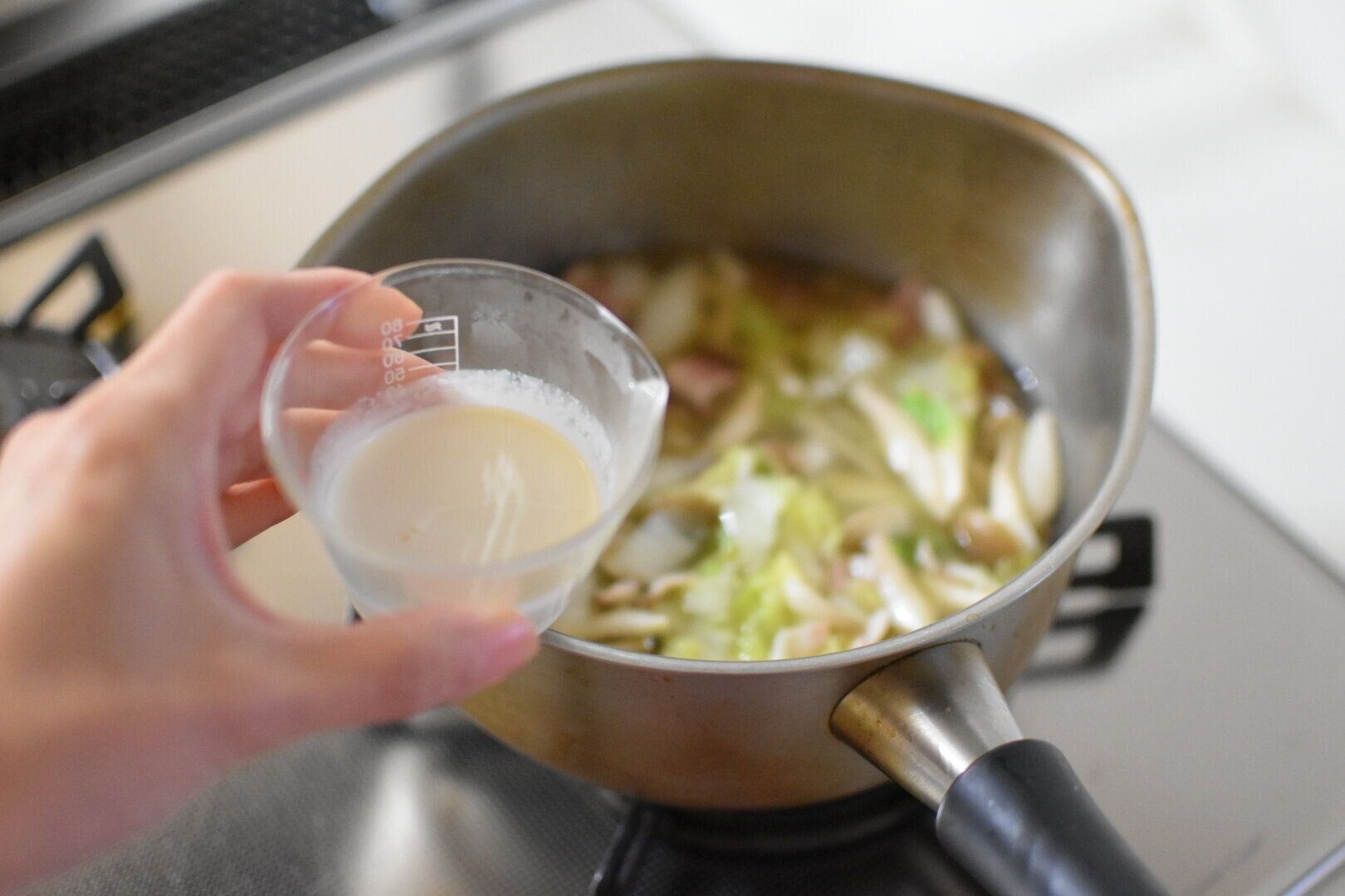 2.白菜がしんなりしたら、火を止めて豆乳を加えて再び加熱する