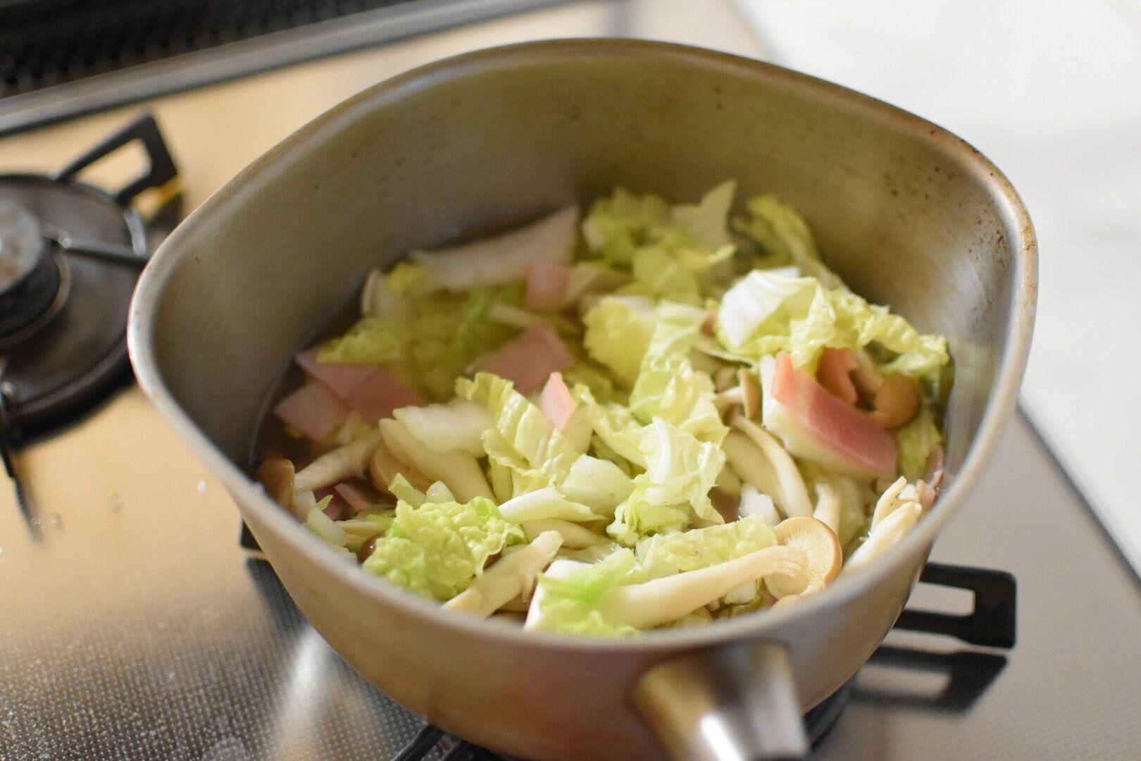 1.白菜、ベーコン、しめじなどお好みの具材は食べやすいサイズにカットし、ひたひたになる程度の水と市販のコンソメの素を加えて中火で加熱し、野菜がしんなりするまで10分ほど煮込む