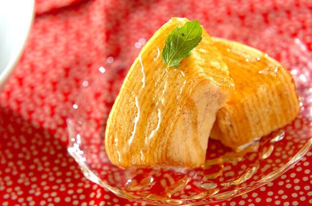 「カラメルバームクーヘン」では、フライパンでグラニュー糖を溶かし、バームクーヘンをカラメルコーティングします。加熱するため、自然解凍したものか電子レンジで解凍したものを活用しましょう。