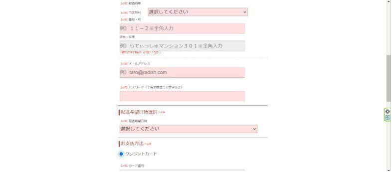 「住所」「メールアドレス」「パスワード」「配送希望日」を入力します。