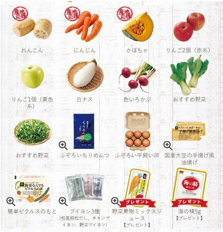 セット内容は、ふぞろいのため通常出荷できない旬の食材が16品ほどと、レシピ冊子が入っています。とある月のセット内容をご紹介します。