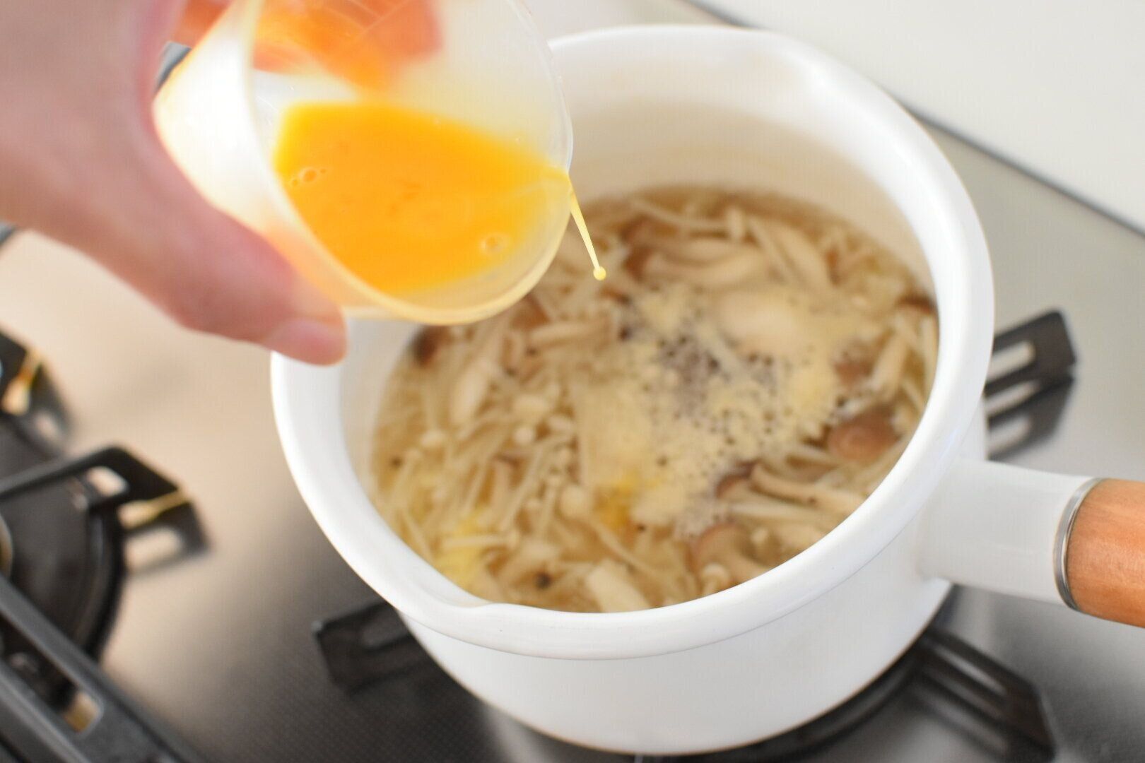 1.しめじ、えのきだけは根元をカットして食べやすいサイズにし、小鍋に水、顆粒鶏ガラスープの素と合わせて入れ、中火で沸騰するまで加熱する