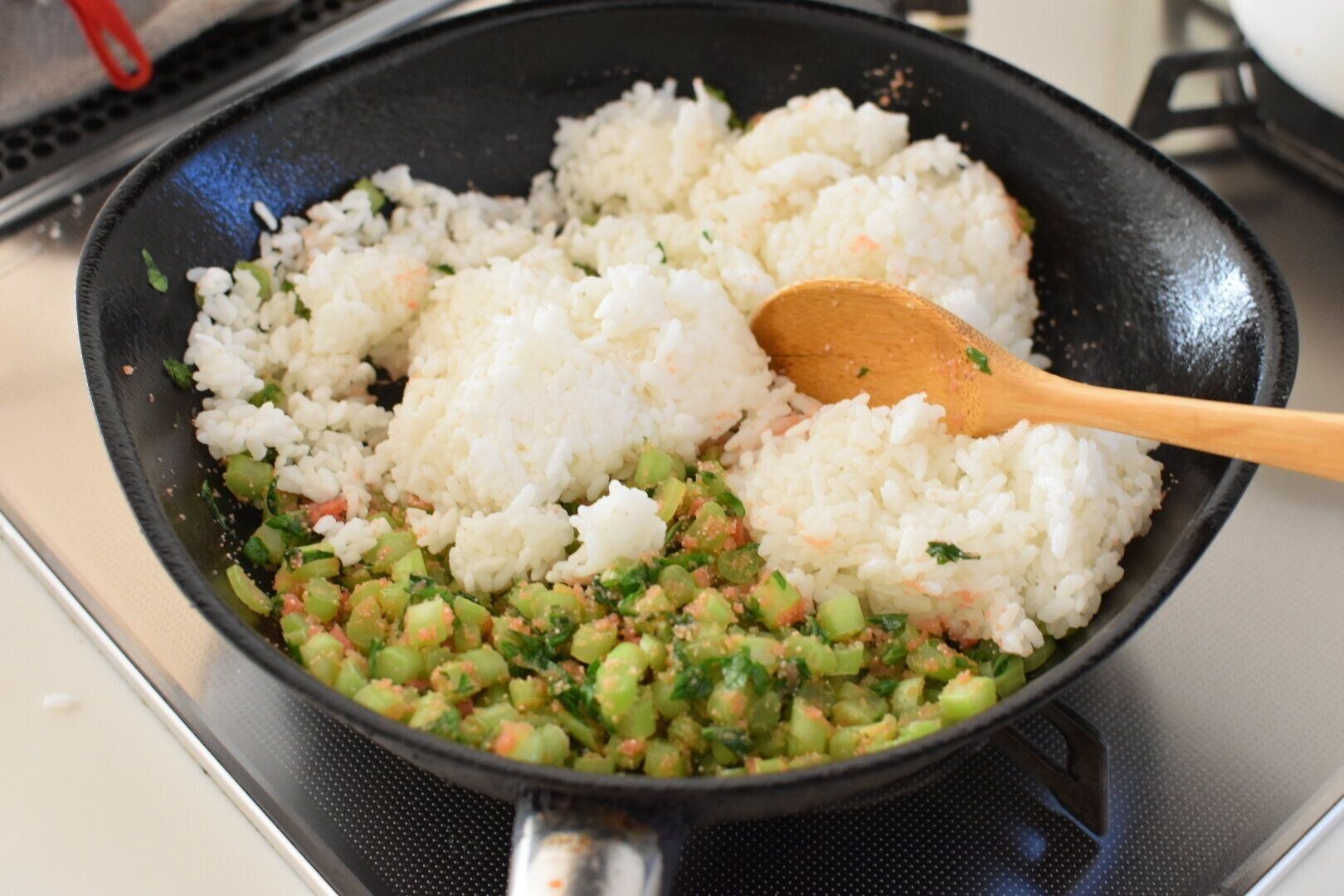 1.フライパンにサラダ油をなじませ、大根葉がしんなりするまで中火で炒め、辛子明太子も加えてさらに炒める