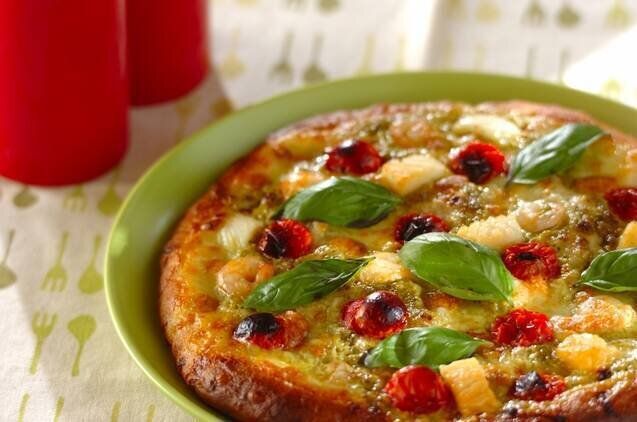 シーフードとバジルのピザ