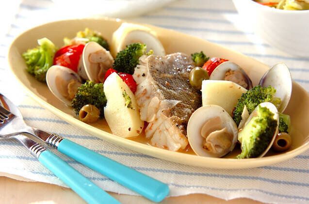 じゃがいもやブロッコリーなどの野菜などといっしょに炒めたハマグリのアクアパッツァは、見た目もオシャレでおもてなしをする際の料理に向いています。