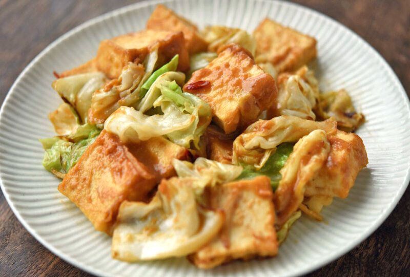 「キャベツと厚揚げの炒め物(味噌炒め)」では、食材を個別に炒め、最後に味噌ダレで炒め合わせます。冷凍味噌であっても、味噌ダレをつくるために解凍する必要はありません。