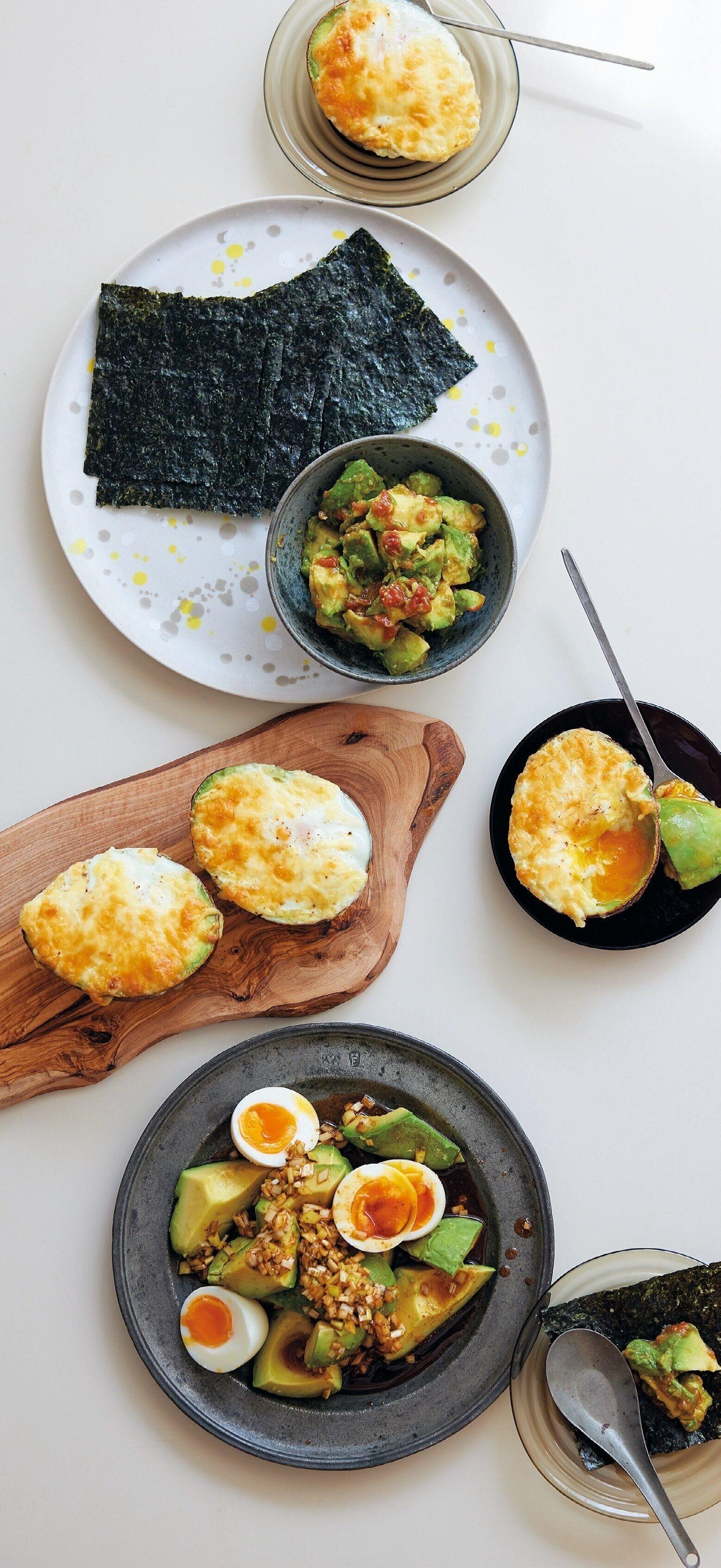 アボカド2個は種を取り、スプーンでくりぬいてごく粗くつぶし、ボウルに入れる。種を除いて包丁でたたいた梅干し2個分、めんつゆ(3倍濃縮)大さじ1/2、オリーブ油小さじ2を加えてあえて器に盛る。焼きのり(全形)3~4枚を4等分に切って添え、巻きながら食べる。