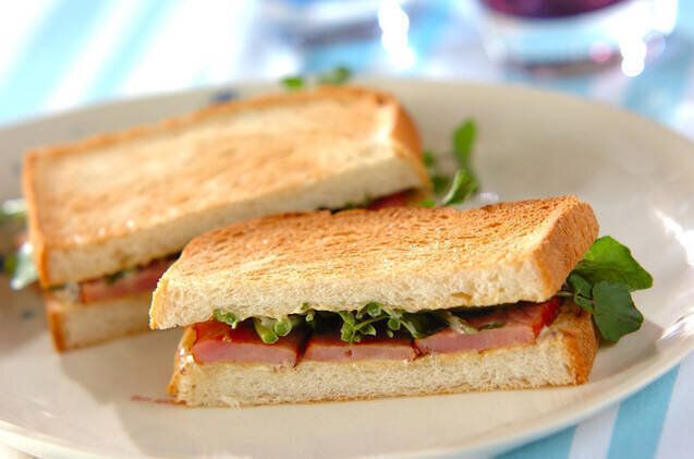 「チャーシューサンド」ではスライスした冷凍チャーシューを使いましょう。調理の工程でチャーシューの両面をあぶりますが、加熱解凍はせず、チャーシューはあらかじめ自然解凍してから使ってください。