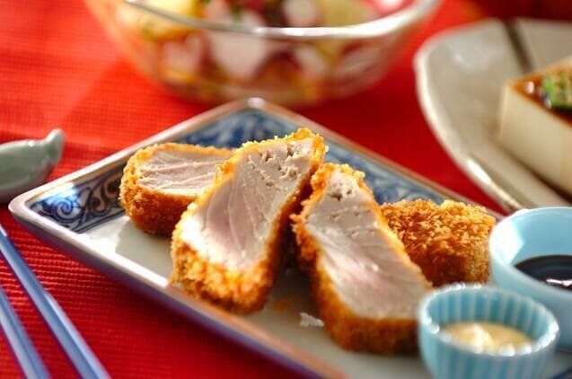 外の衣はこんがりカリッとするまで揚げ、中はレアになっています。塩やウスターソースなど、好みの薬味や味付けで食べてみましょう。