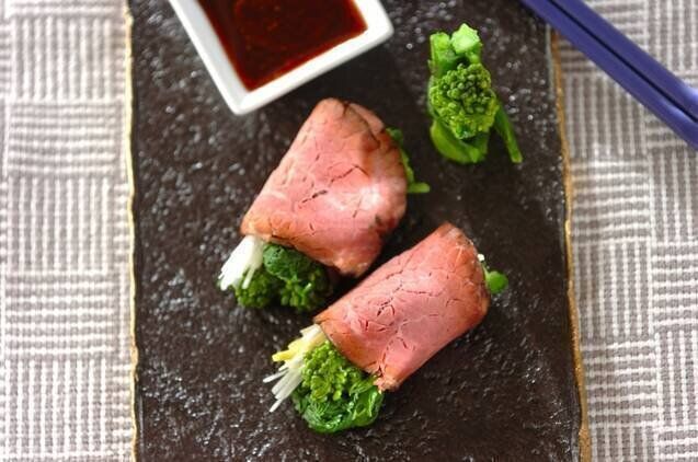 ローストビーフに菜の花、白ネギなどを乗せて巻いた和風ロールは、彩りも華やかですので、お祝いの席やパーティーなどにピッタリです。