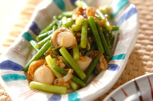 続いて紹介するのがニンニクの芽のシンプル炒めです。材料は缶詰のホタテとニンニクの芽、ショウガだけなので簡単に作れます。