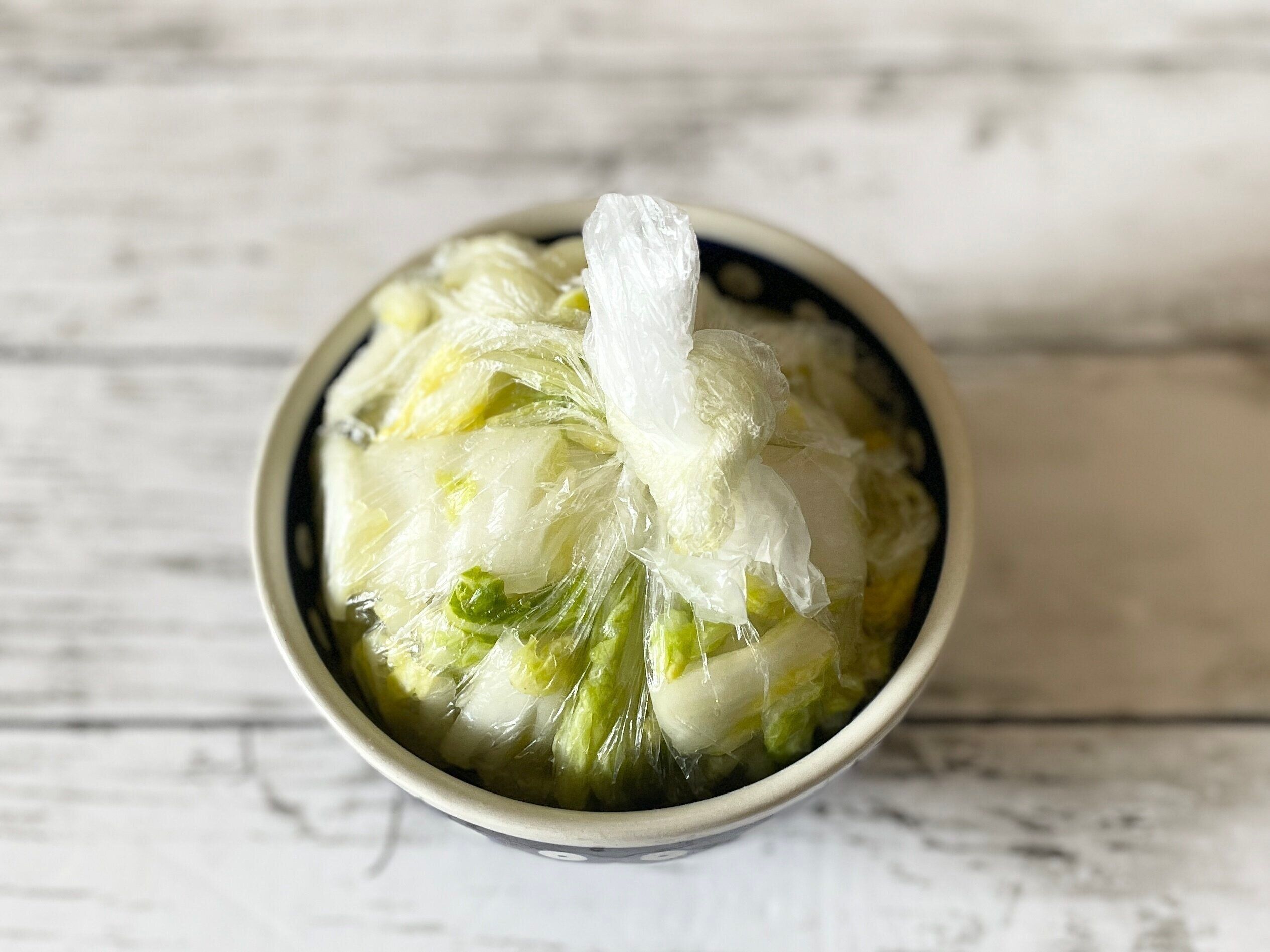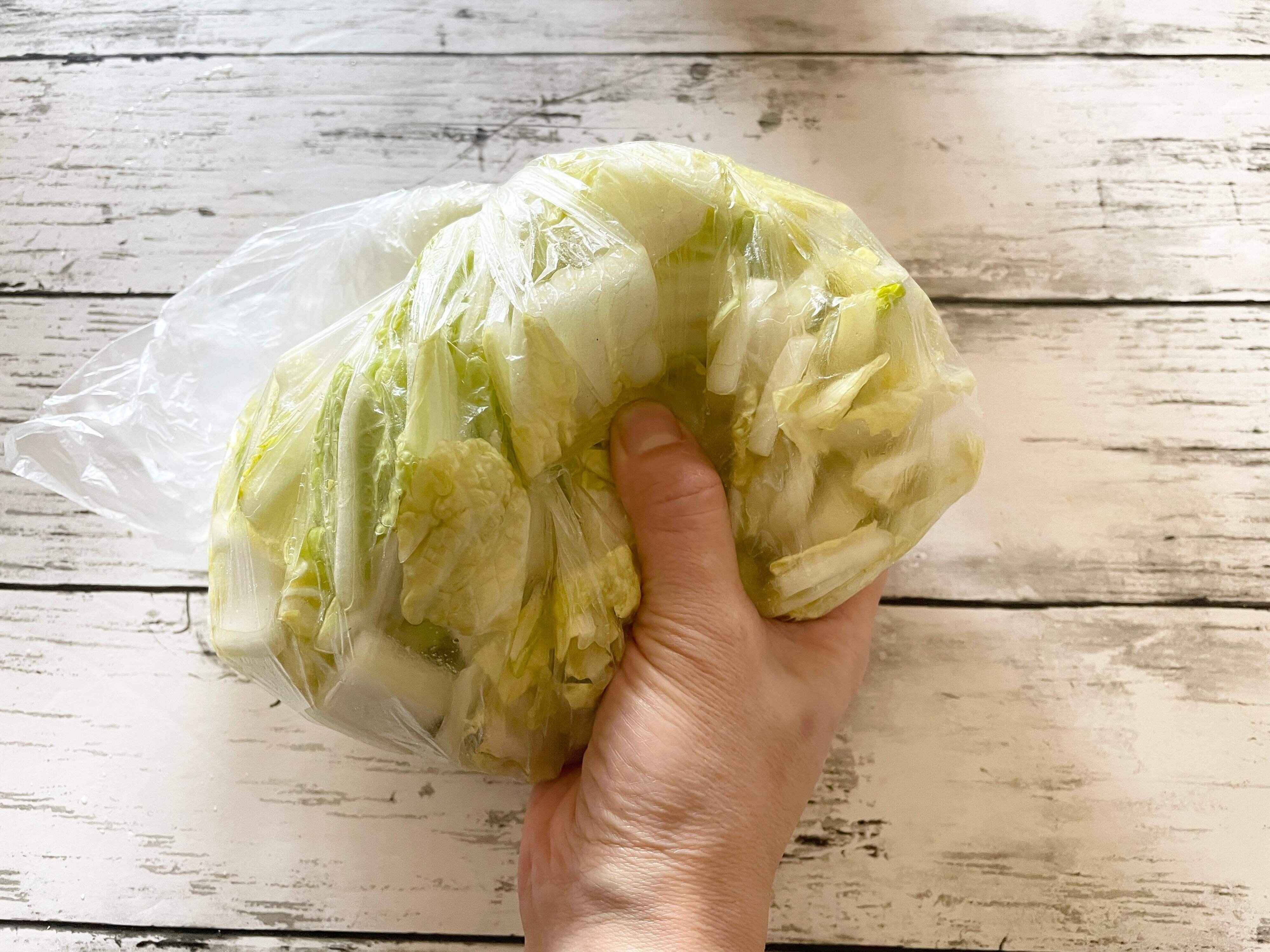 白菜がしんなりしたらポリ袋の空気を抜いて口を縛り、冷蔵庫で30分から1時間ほど放置します。
