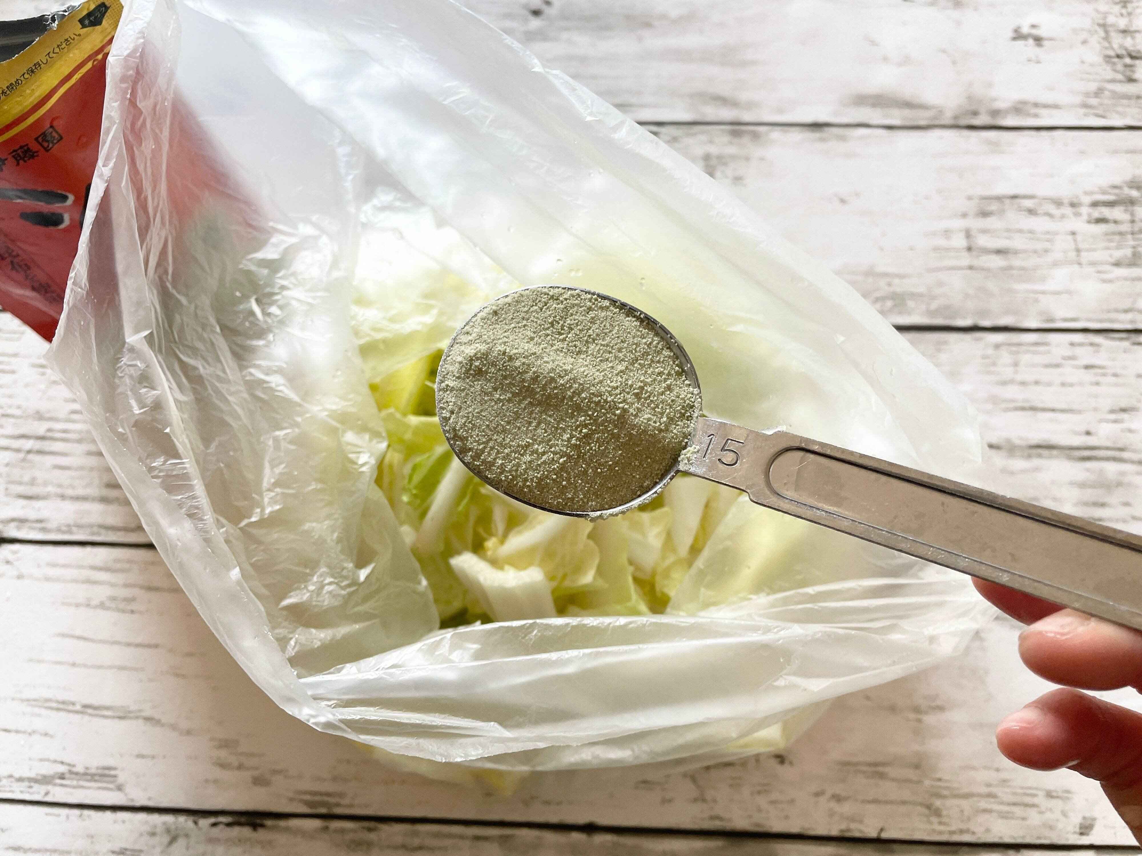 切った白菜をポリ袋に入れ、上から昆布茶も入れます。
