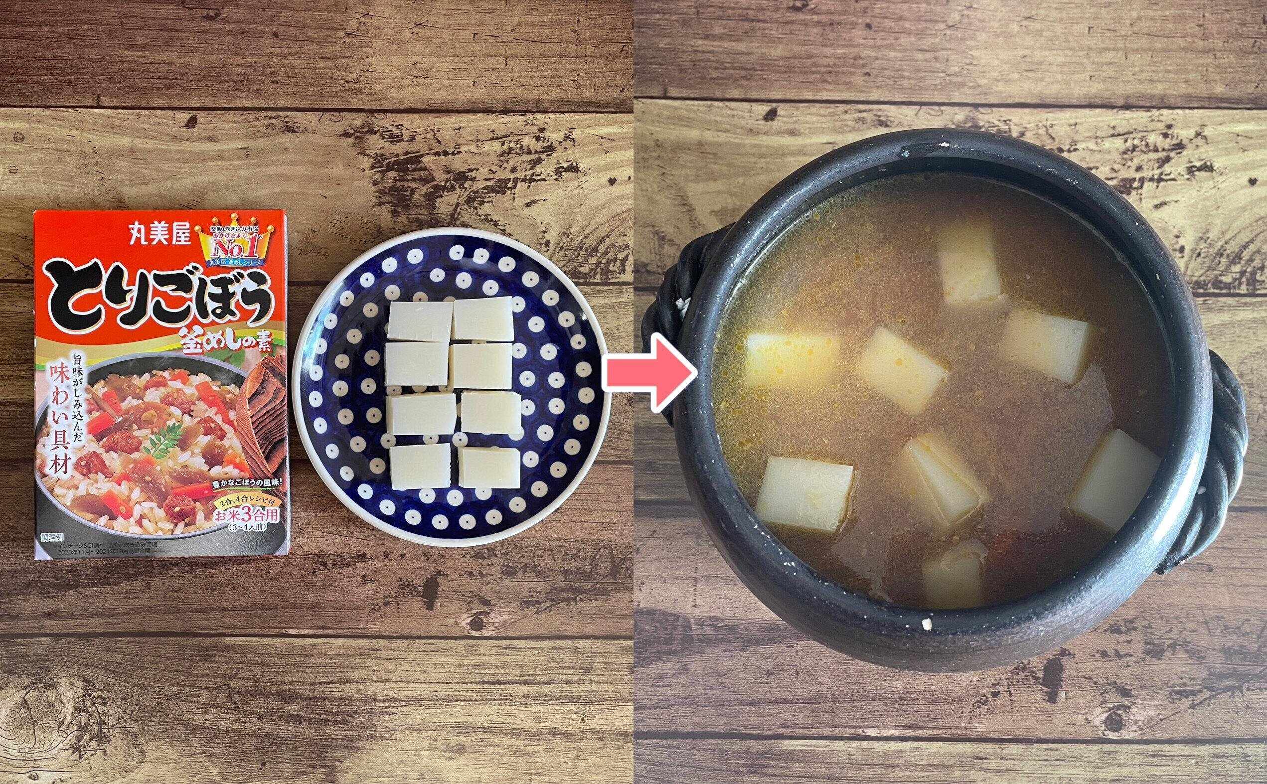 炊き込みご飯の素を使ってしまえばさらに簡単です。パッケージに書いてある通りに水加減などを済ませたら、おもちを入れて炊くだけ。