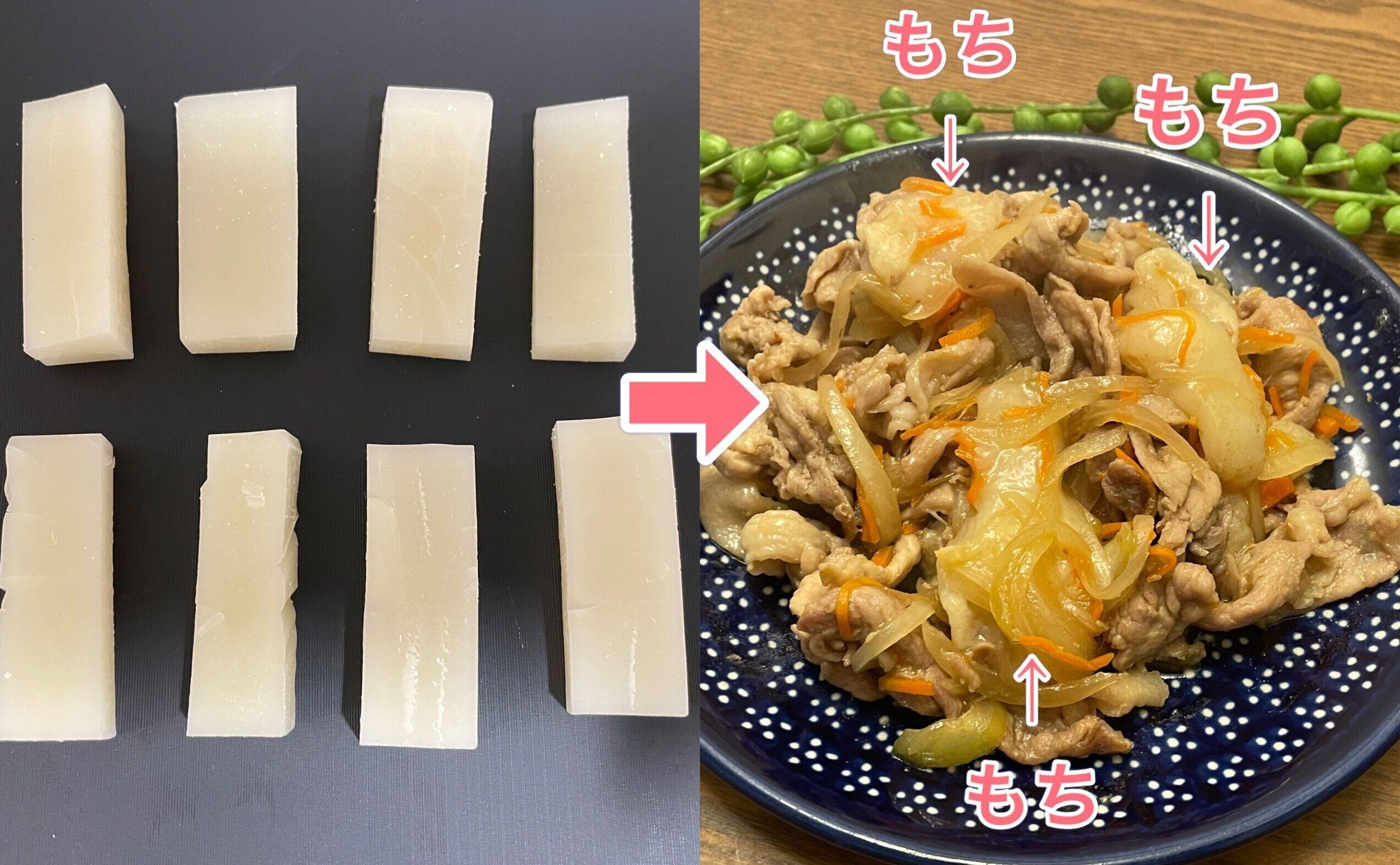 切りもちを8~10当分くらいの細切りにして、肉や野菜と一緒に炒めるだけ。味つけはいつも通りで大丈夫ですよ。