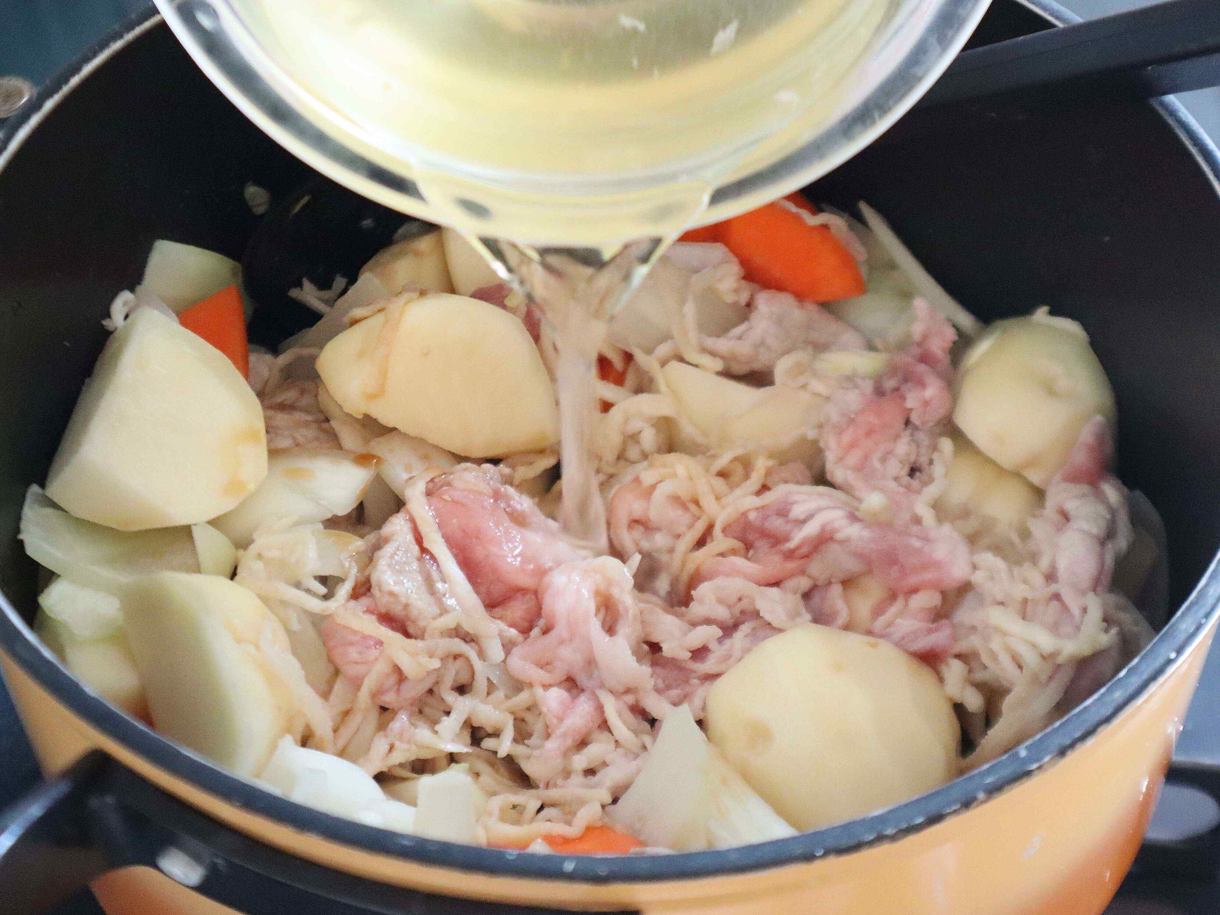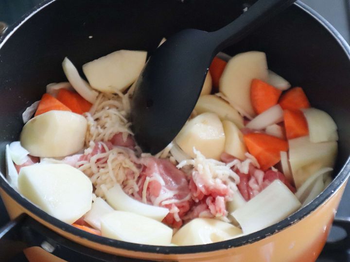 (3) 鍋にごま油を熱し、じゃがいも、にんじん、たまねぎ、豚肉、切り干し大根を入れて油がまわるまで中火で炒める。