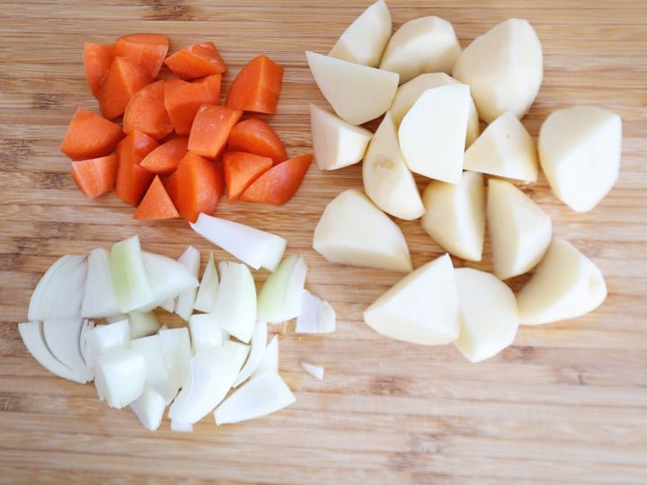 (2) じゃがいもは皮をむいて4〜6等分、たまねぎは皮をむいてくし切りを半分に、にんじんはじゃがいもより小さめの乱切りにする。